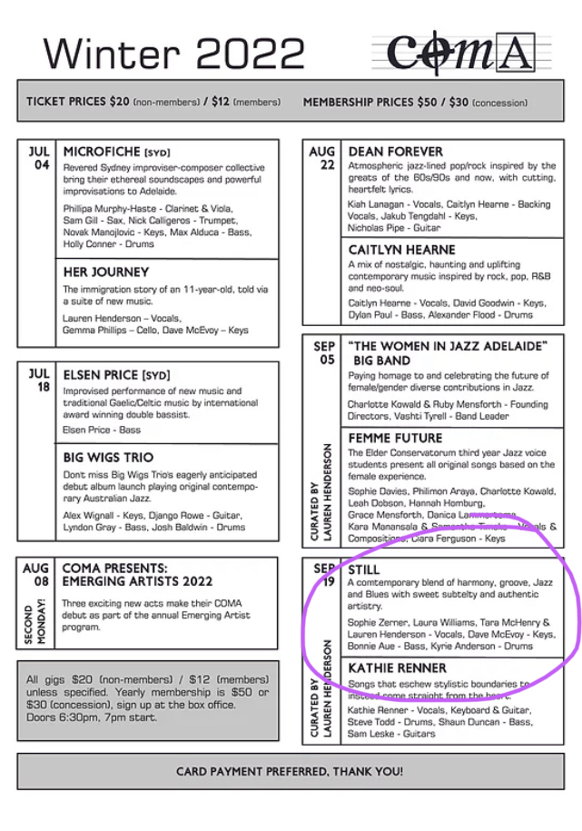 Monday 19 September 2022, with Lauren Henderson and band at the Wheatsheaf Hotel, Adelaide, SA